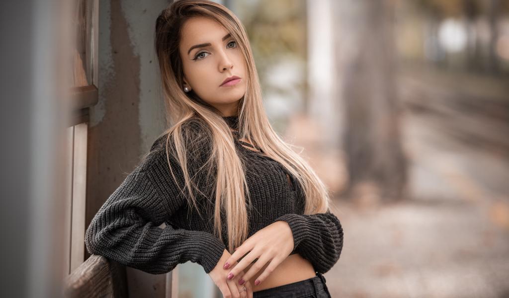 Wallpaper Beautiful blonde in a knitted sweater near the wall