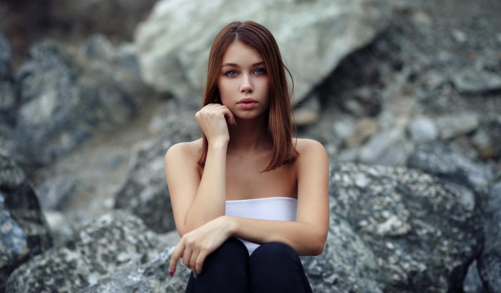 Wallpaper Young girl with a blue hat is sitting on the beach