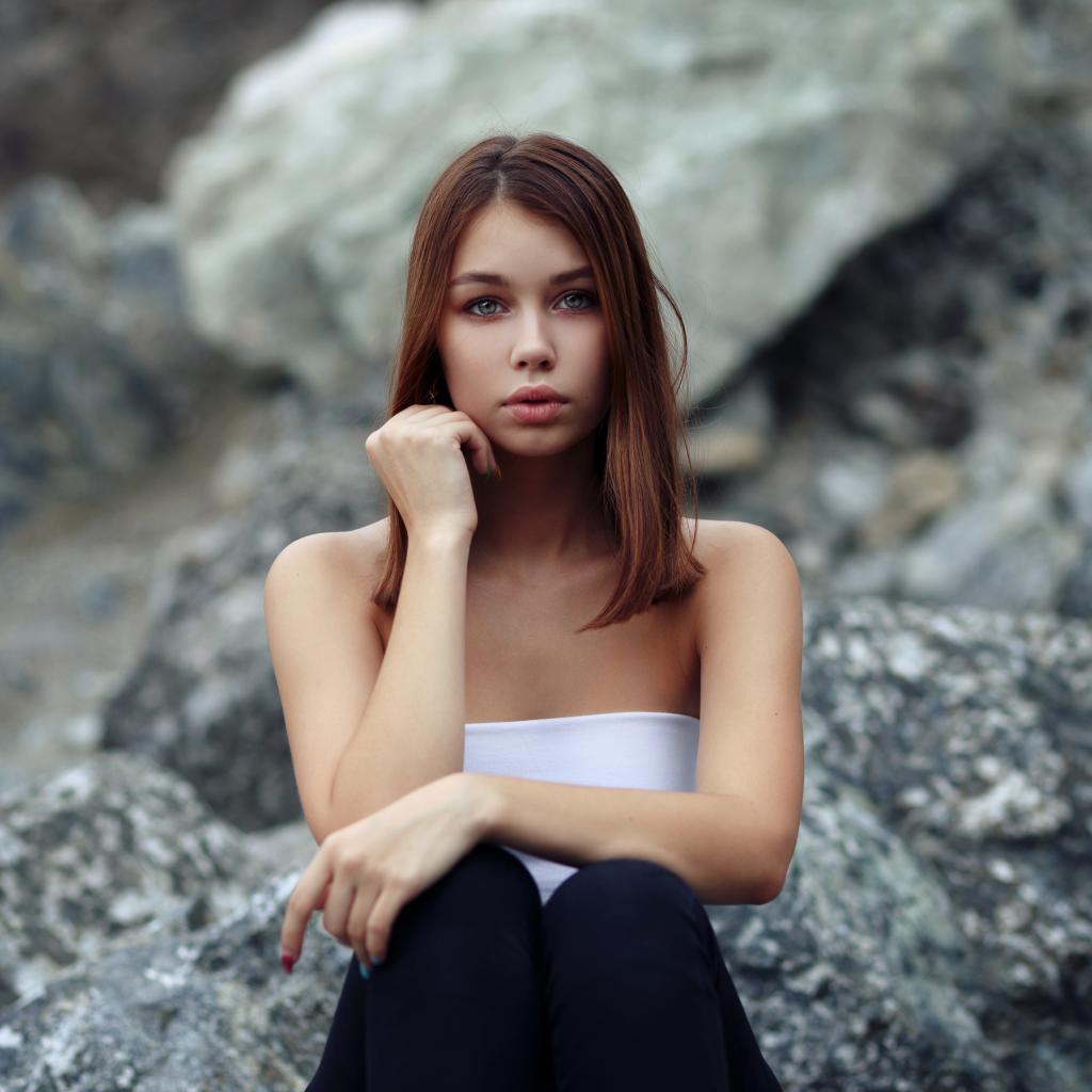 Wallpaper Young girl with a blue hat is sitting on the beach