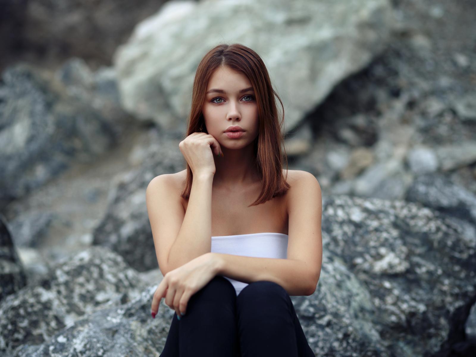 Wallpaper Young girl with a blue hat is sitting on the beach