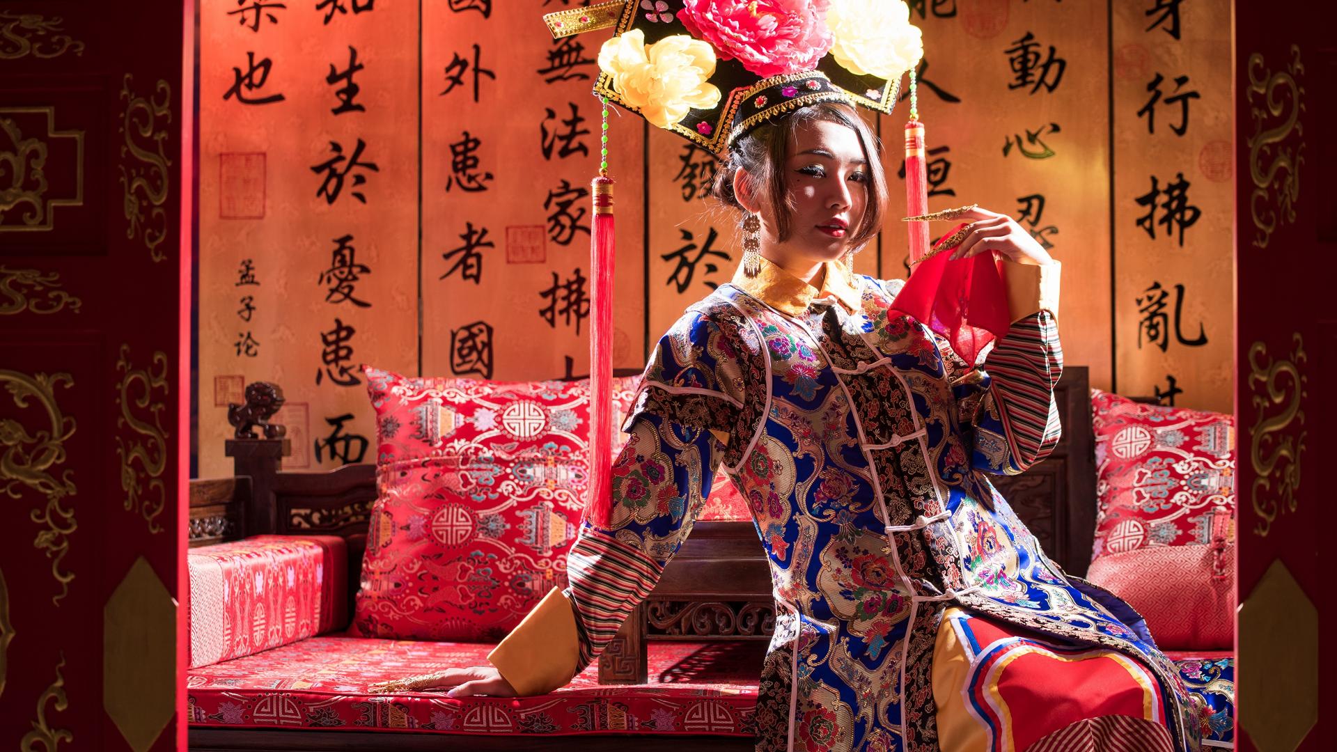 Wallpaper Beautiful Asian girl in national costume on the sofa