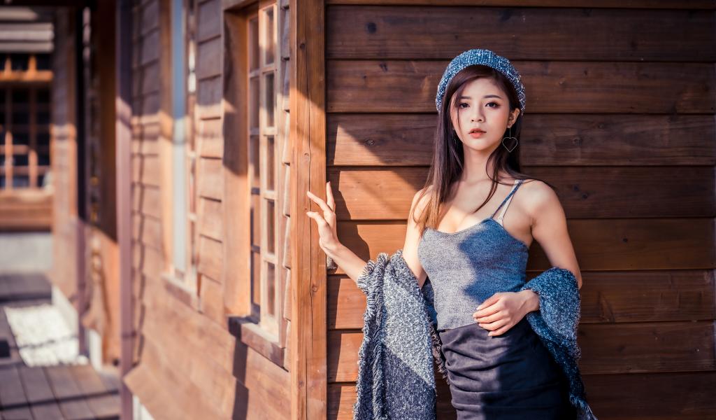 Wallpaper Beautiful asian girl standing by a wooden wall