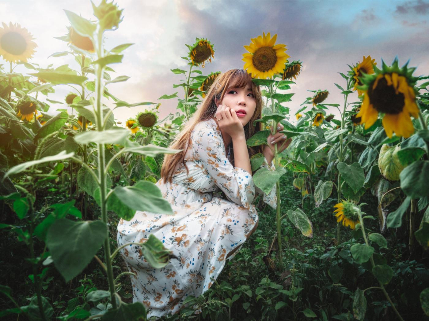 Wallpaper Beautiful asian girl on the field with sunflowers