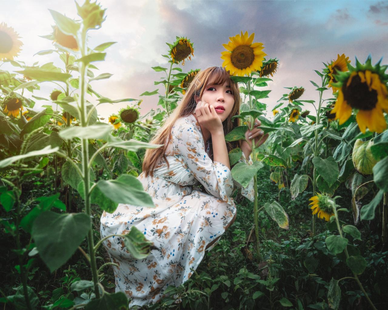 Wallpaper Beautiful asian girl on the field with sunflowers