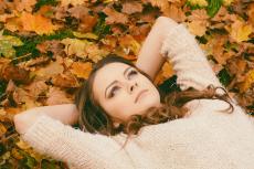 Wallpaper Dreamy girl in a sweater lies on the ground
