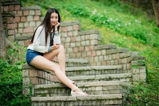 Wallpaper Long haired Asian girl sitting on old steps