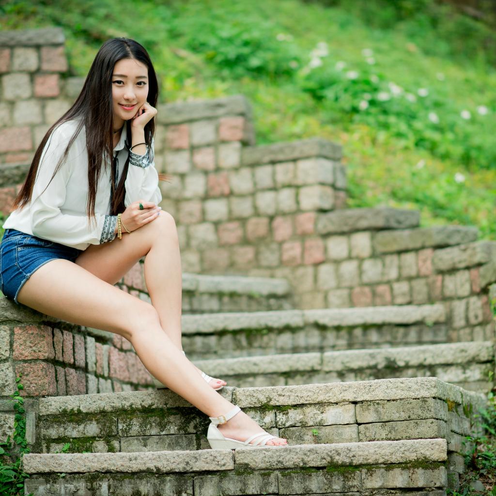 Wallpaper Long haired Asian girl sitting on old steps