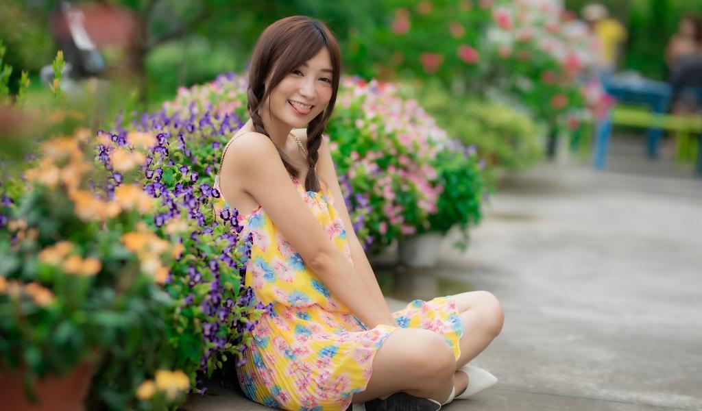 Wallpaper Funny asian girl in dress sits on the ground