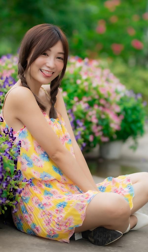 Wallpaper Funny asian girl in dress sits on the ground