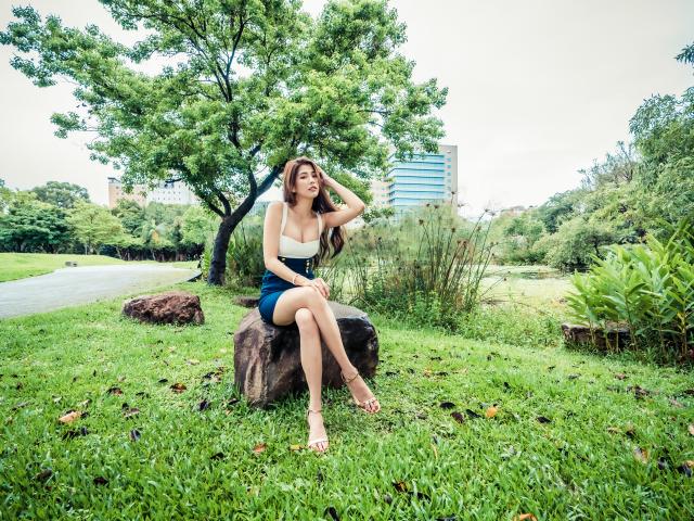 Wallpaper Spectacular Asian girl sits on a stone in the park