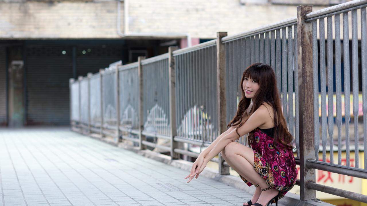 Wallpaper Asian girl in a sundress sits at the iron fence