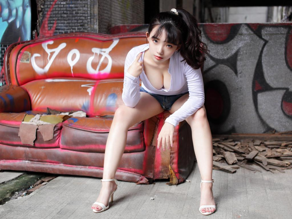 Wallpaper Long-haired Asian girl sitting on an old sofa