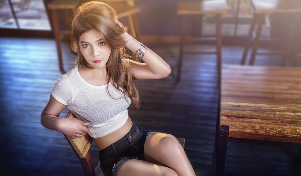 Wallpaper Asian girl sitting on a wooden chair in a cafe