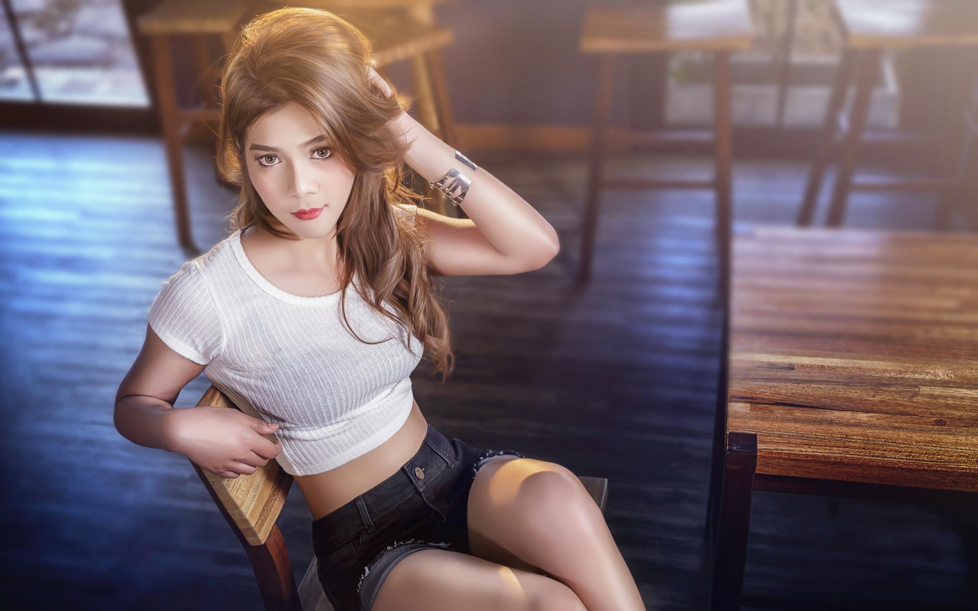Wallpaper Asian girl sitting on a wooden chair in a cafe