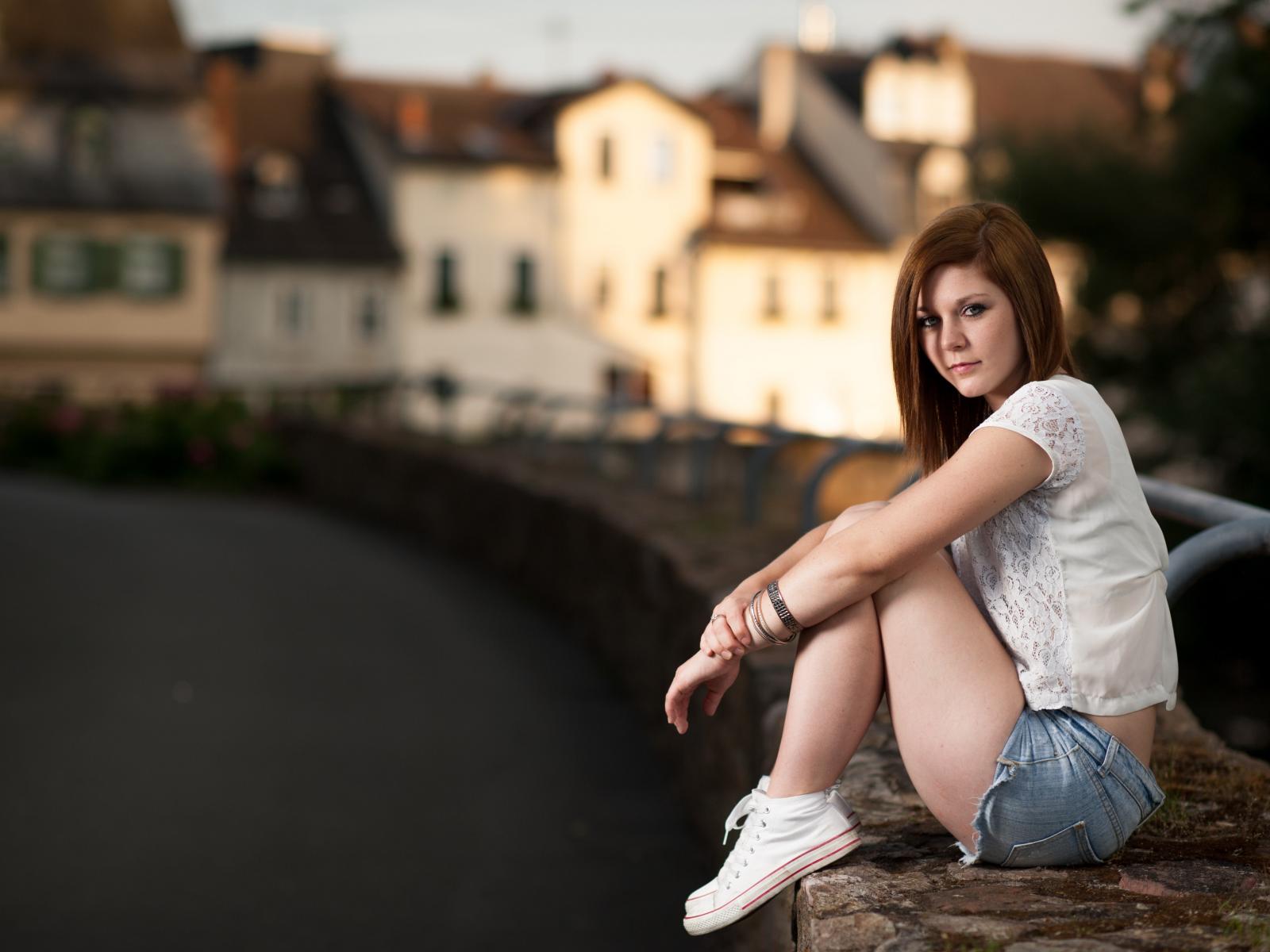 Wallpaper Young girl with short hair sitting on the street