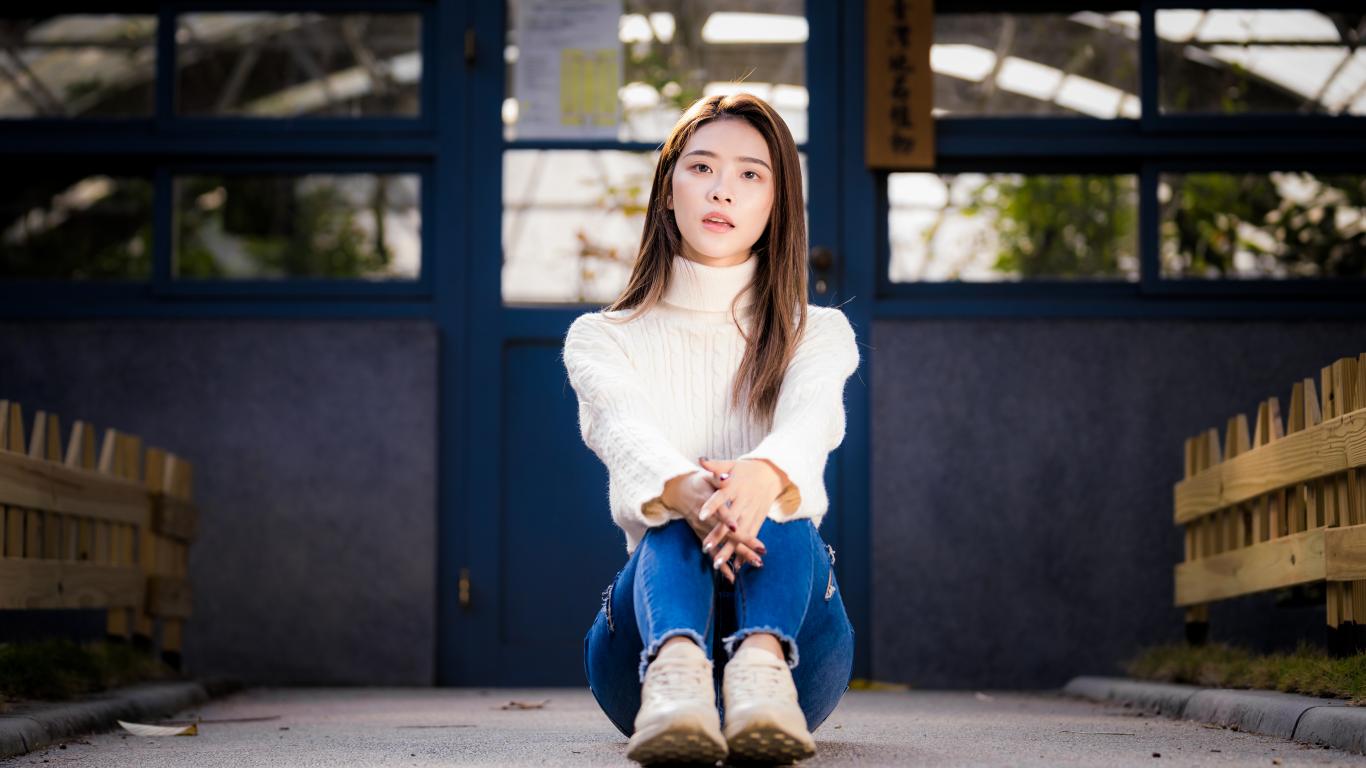 Wallpaper Beautiful asian woman in blue jeans sits on the ground