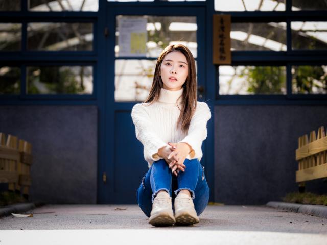 Wallpaper Beautiful asian woman in blue jeans sits on the ground