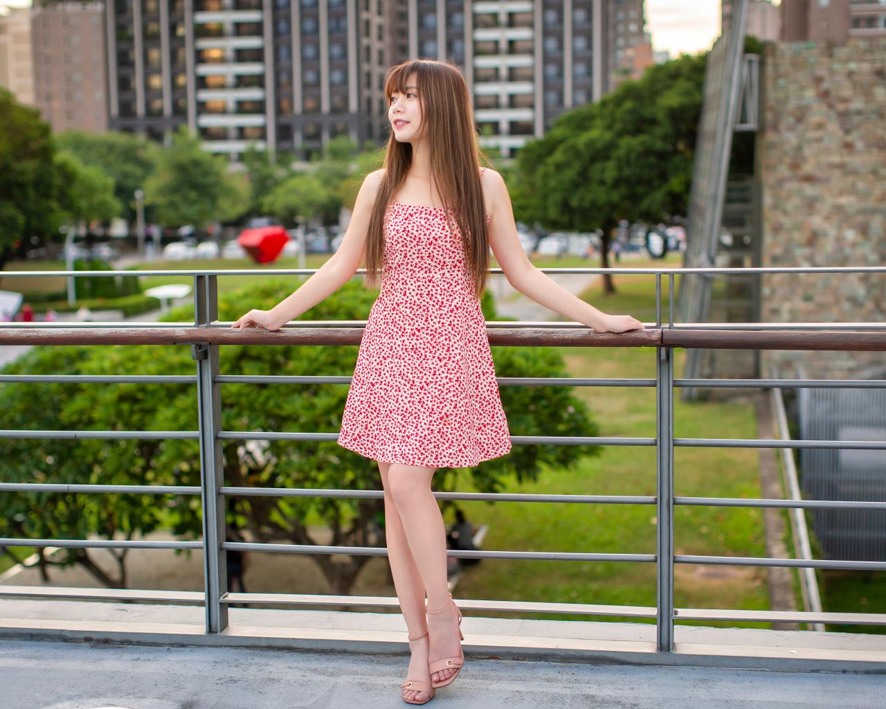 Wallpaper Cute Asian girl in a dress stands at the railing