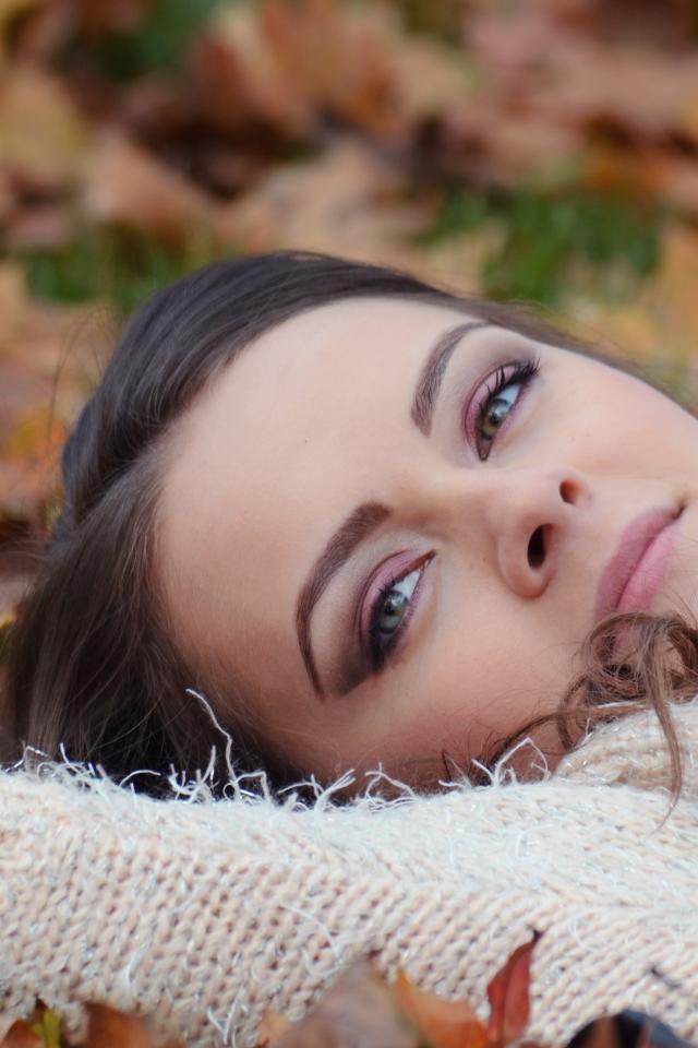 Wallpaper A beautiful girl in a warm sweater lies on dry foliage