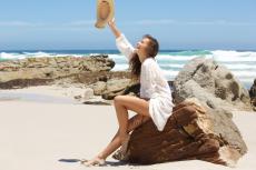 Wallpaper Beautiful girl in a white dress near a stone wall