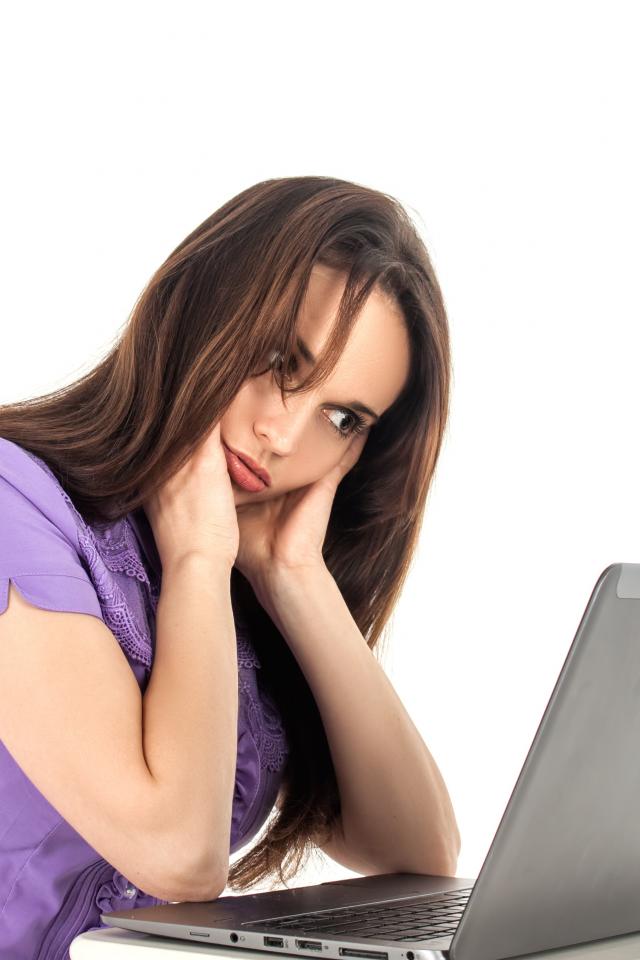 Wallpaper Young girl sitting at a laptop on a white background