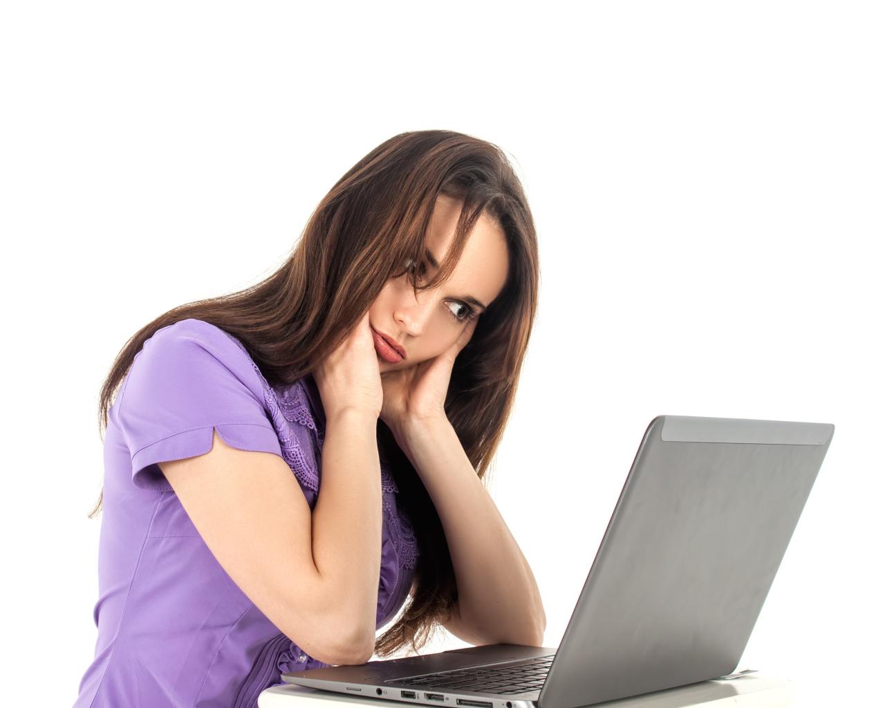 Wallpaper Young girl sitting at a laptop on a white background