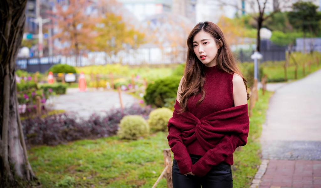 Wallpaper Beautiful asian girl in a red outfit in the park