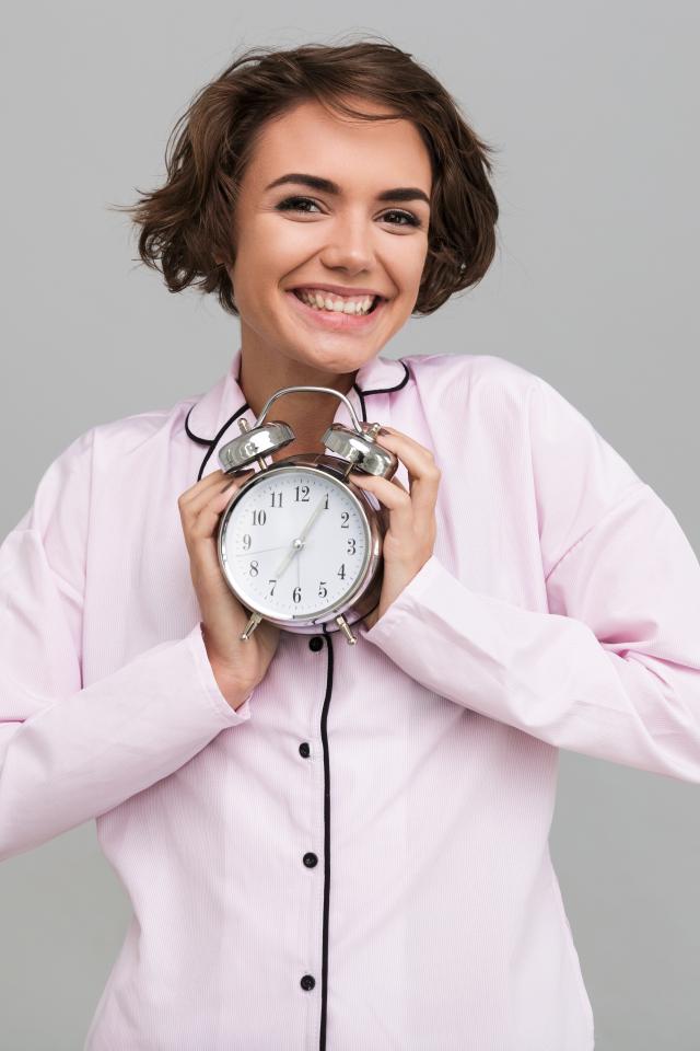 Wallpaper Smiling girl in pajamas holding an alarm clock