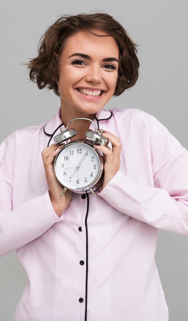 Wallpaper Smiling girl in pajamas holding an alarm clock
