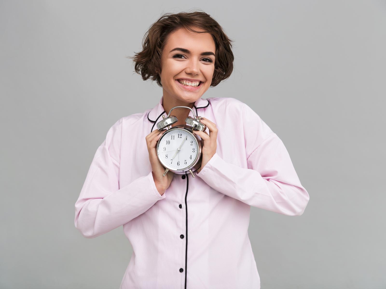 Wallpaper Smiling girl in pajamas holding an alarm clock
