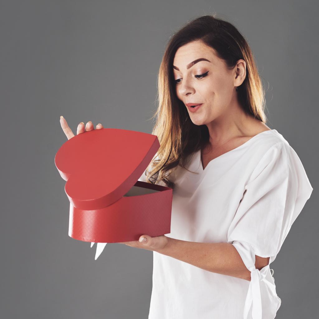 Wallpaper Curious girl looking at a red heart-shaped box