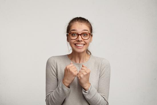 Wallpaper Joyful girl in glasses for sight on a gray background