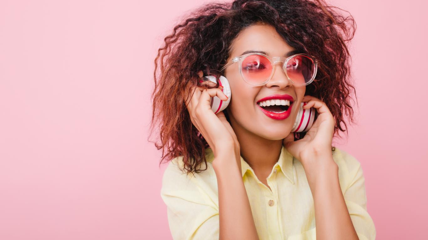 Wallpaper Bright smiling girl listening to music on headphones