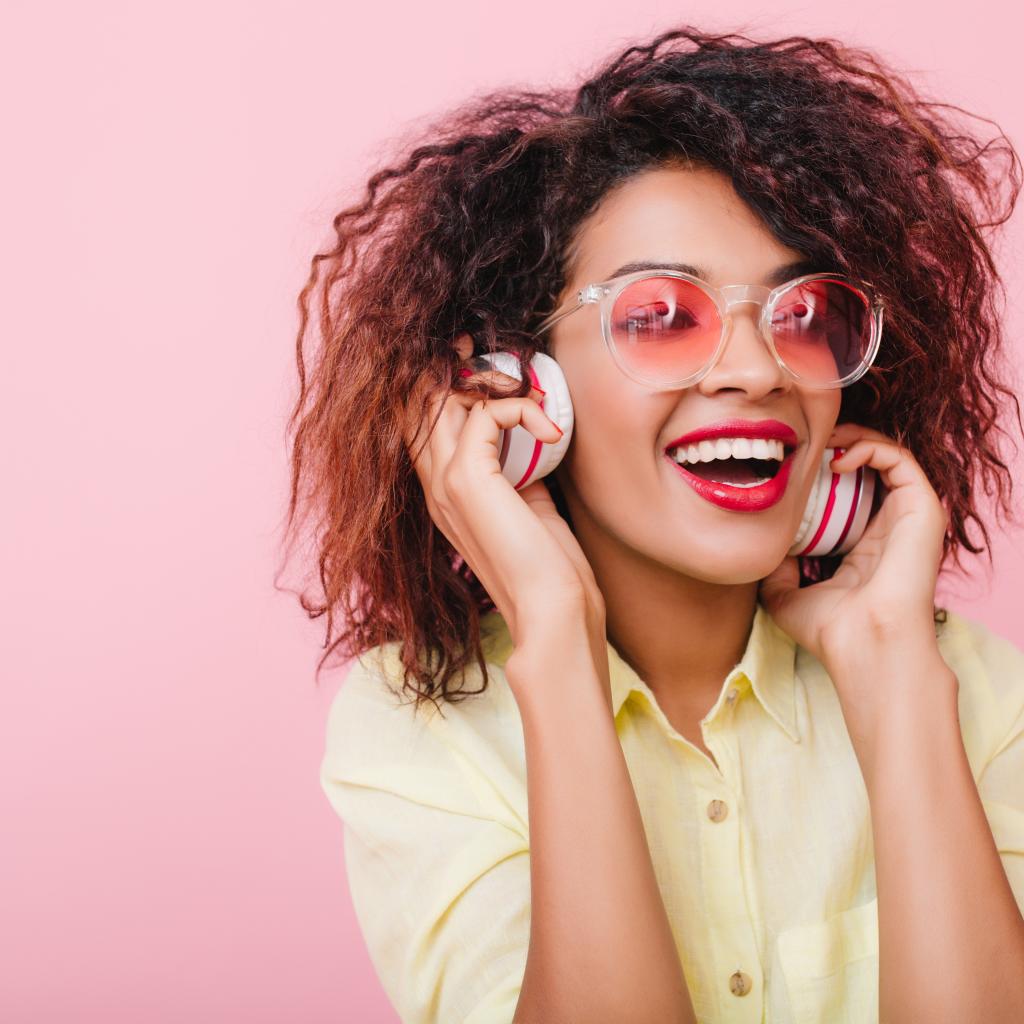 Wallpaper Bright smiling girl listening to music on headphones