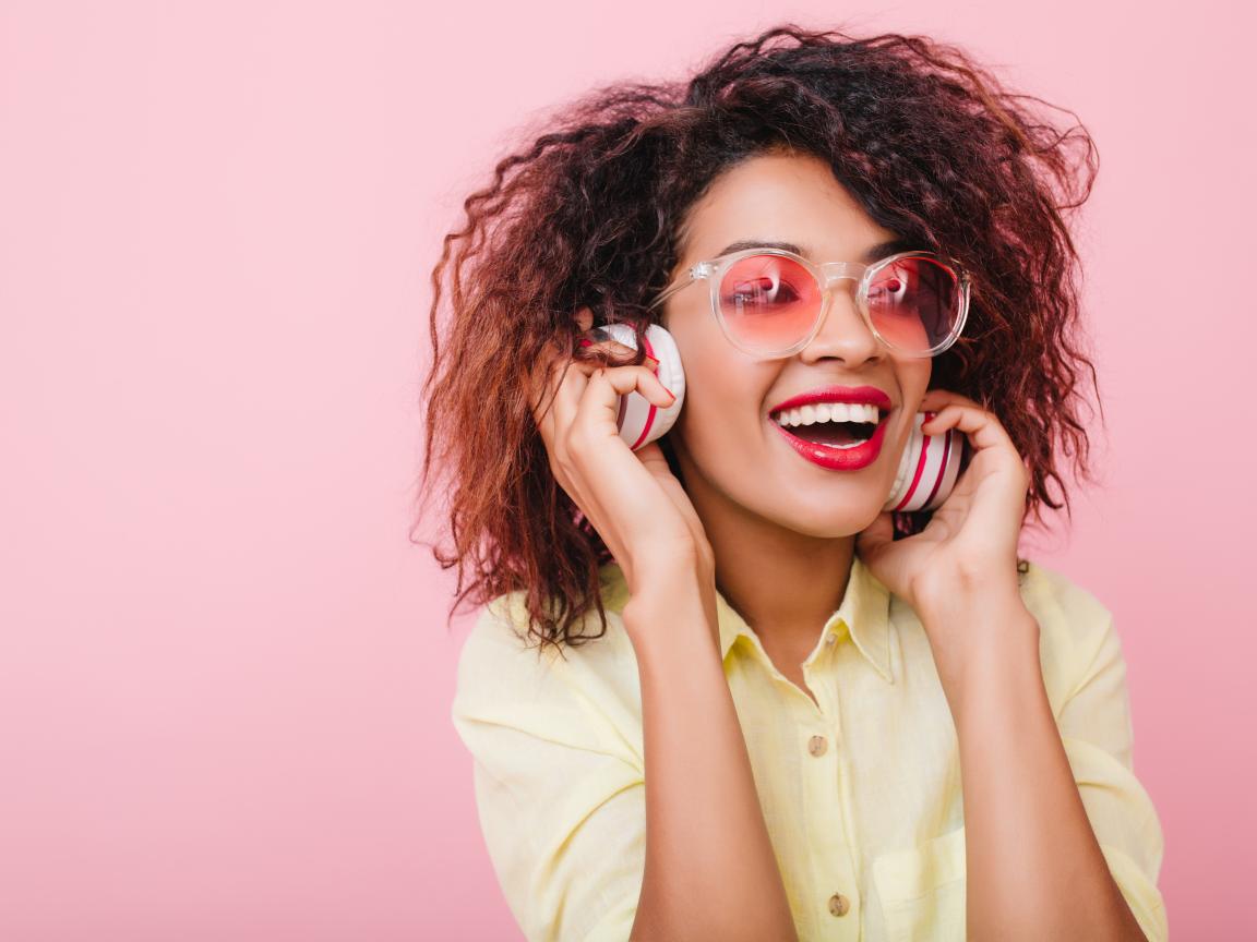 Wallpaper Bright smiling girl listening to music on headphones