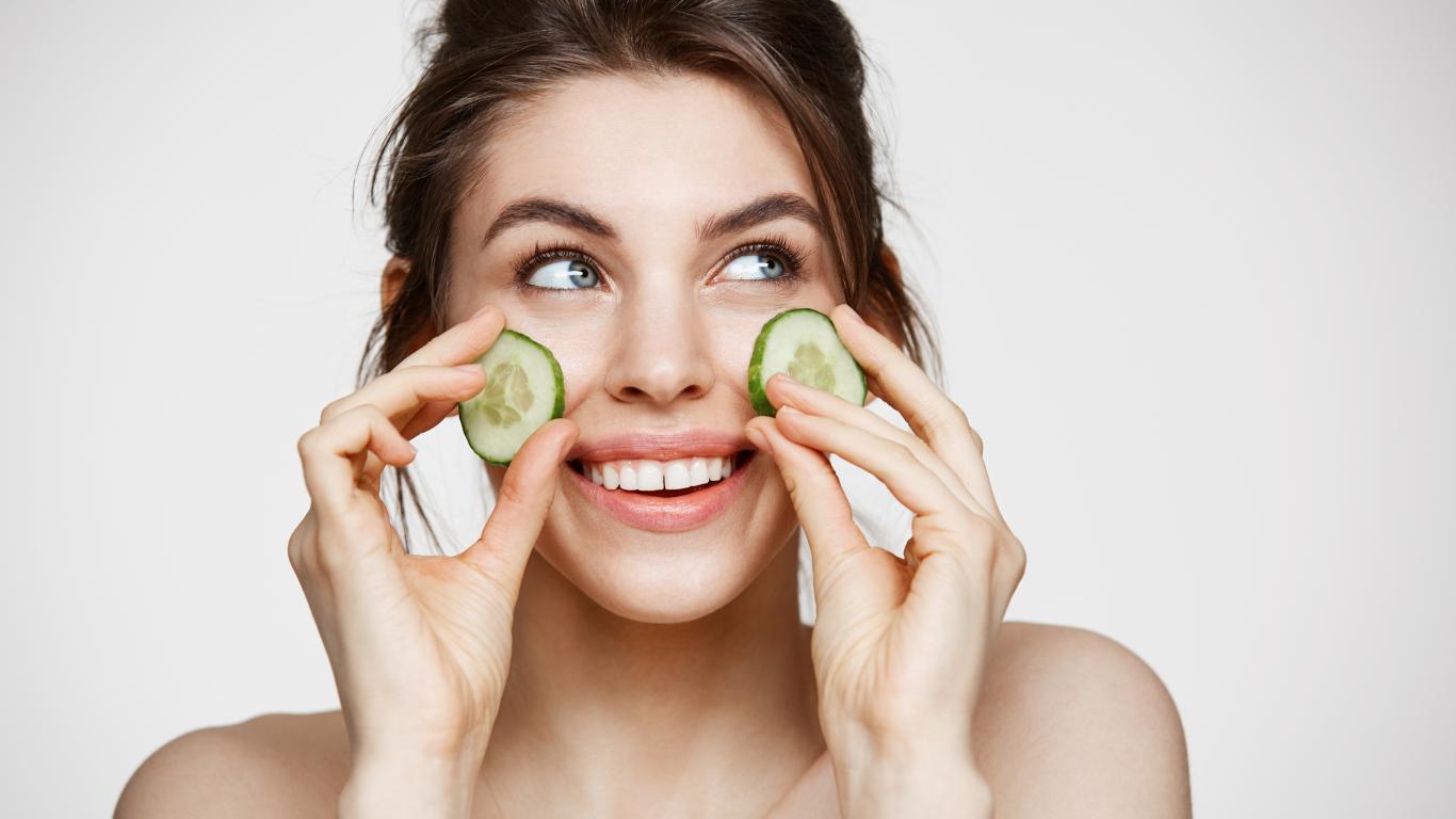 Wallpaper Blue-eyed girl applies cucumbers to her face