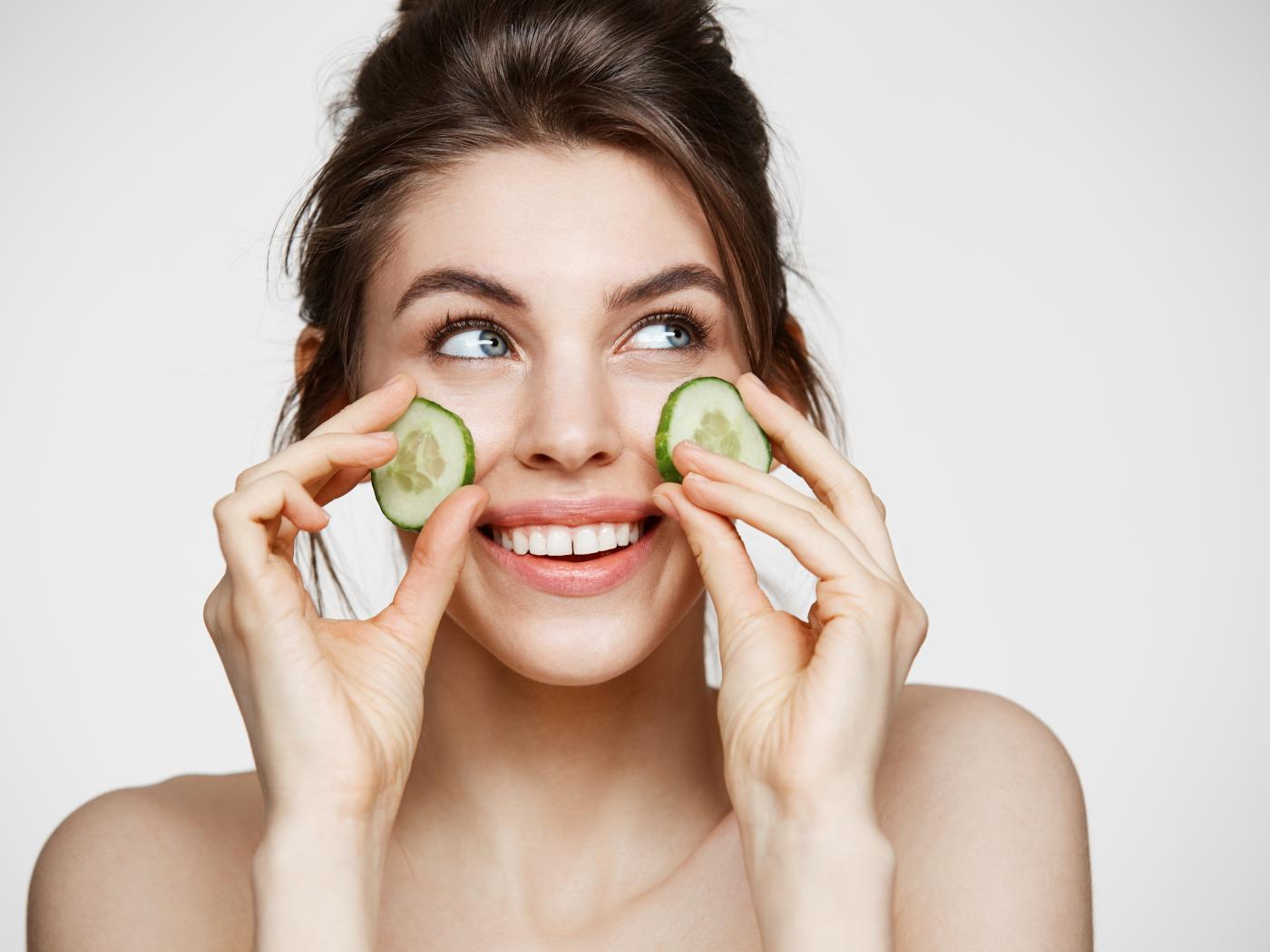 Wallpaper Blue-eyed girl applies cucumbers to her face