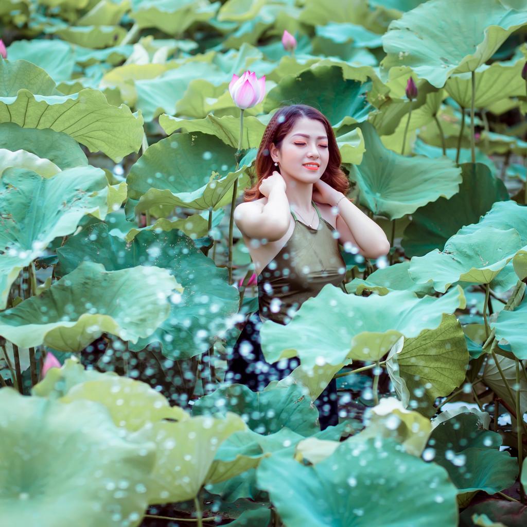 Wallpaper Beautiful asian girl in green lotus leaves