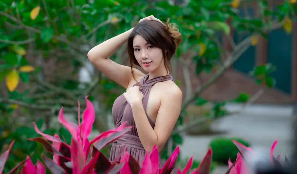 Wallpaper Beautiful Asian girl in a dress near red flowers