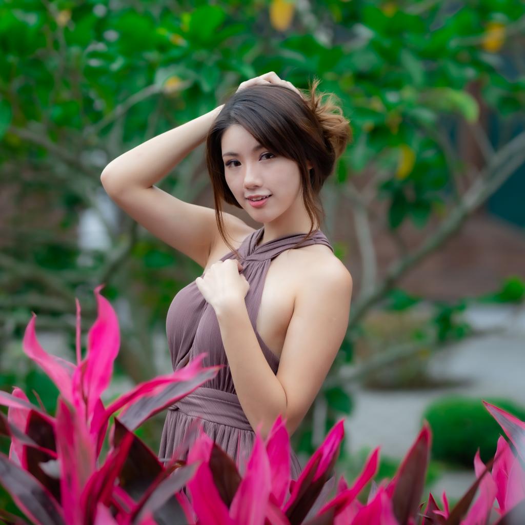 Wallpaper Beautiful Asian girl in a dress near red flowers