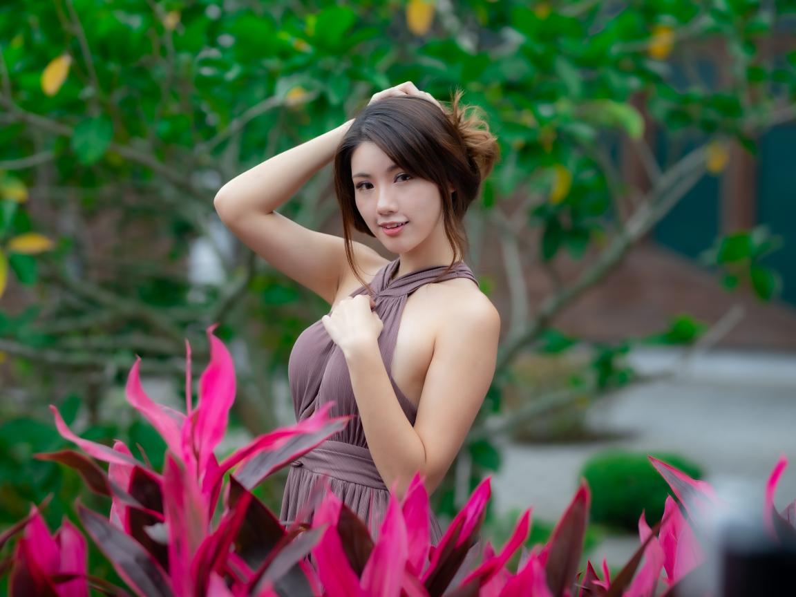Wallpaper Beautiful Asian girl in a dress near red flowers
