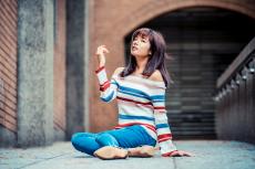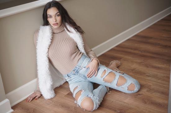 Wallpaper Young girl in torn jeans sits against the wall