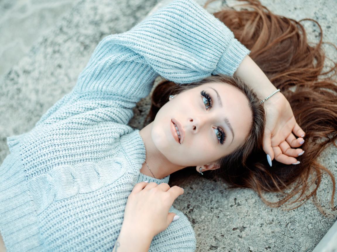 Wallpaper Long-haired girl in a blue sweater lies on the ground
