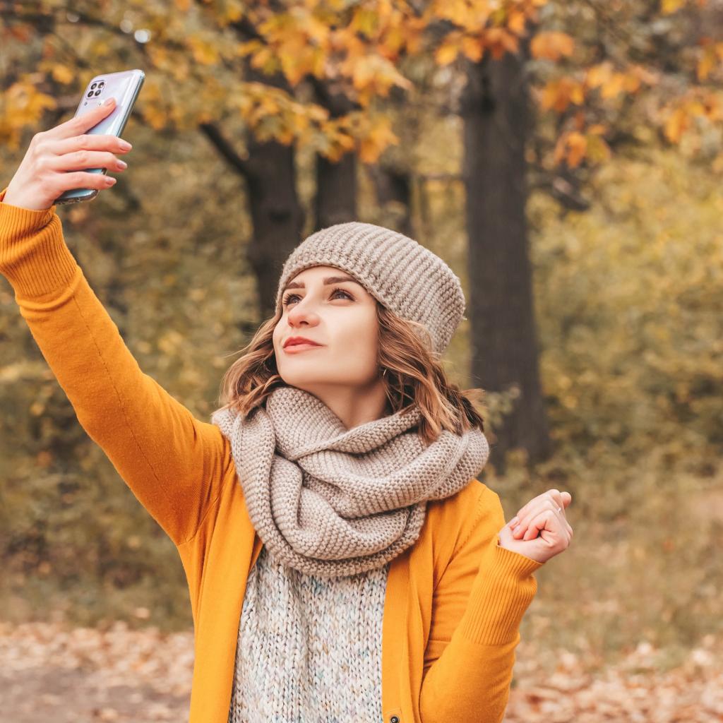 Wallpaper Girl taking selfie on the street in autumn