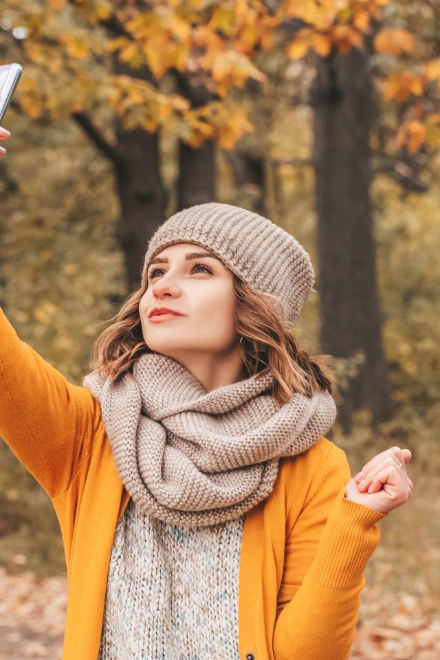 Wallpaper Girl taking selfie on the street in autumn