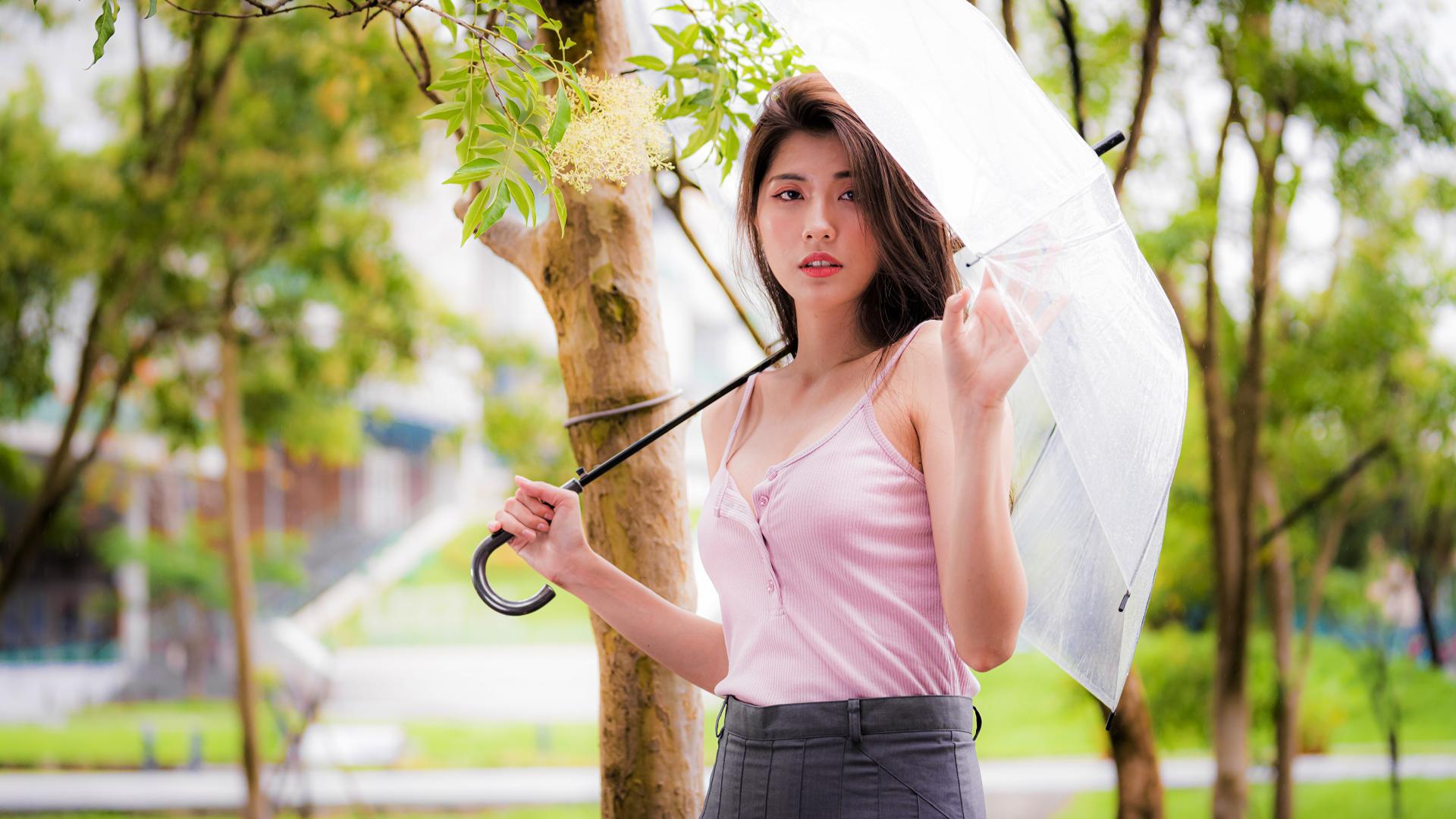 Wallpaper Beautiful gentle Asian in a lilac dress with an umbrella in hand
