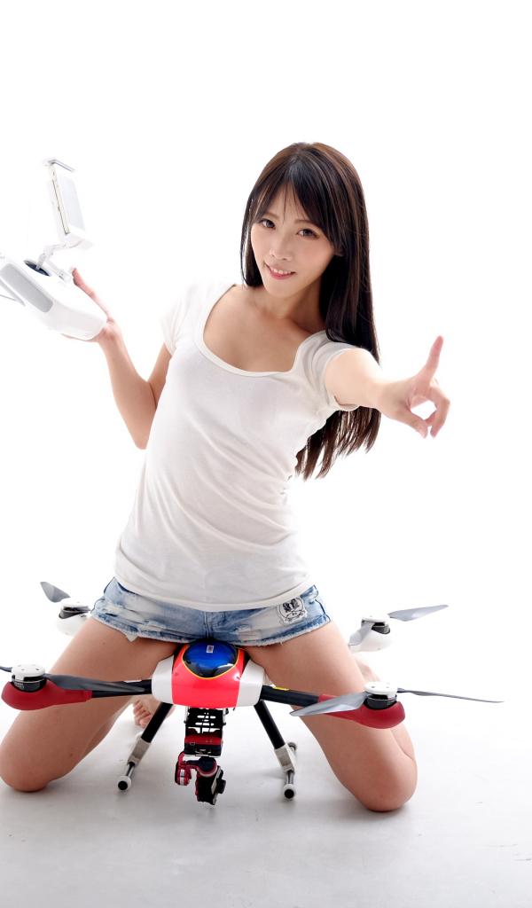 Wallpaper Asian girl with quadrocopter on white background