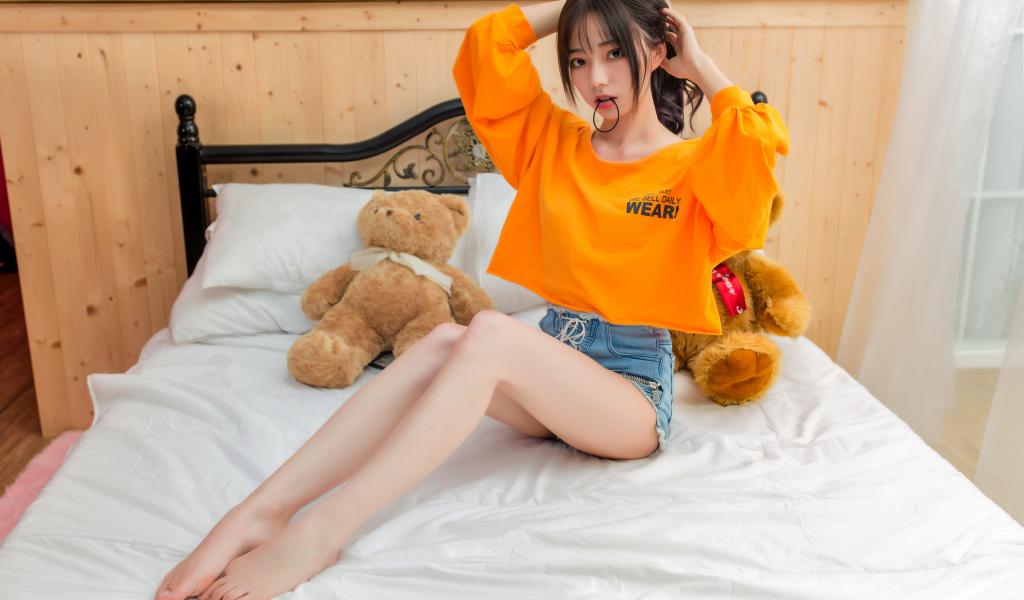 Wallpaper Asian girl on the bed with toys