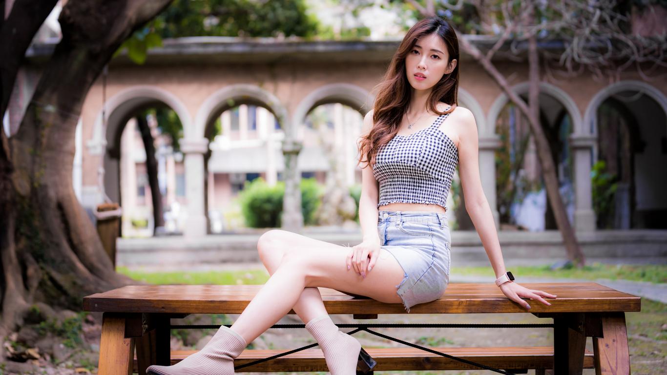 Wallpaper Beautiful Asian woman sits on a bench in the park