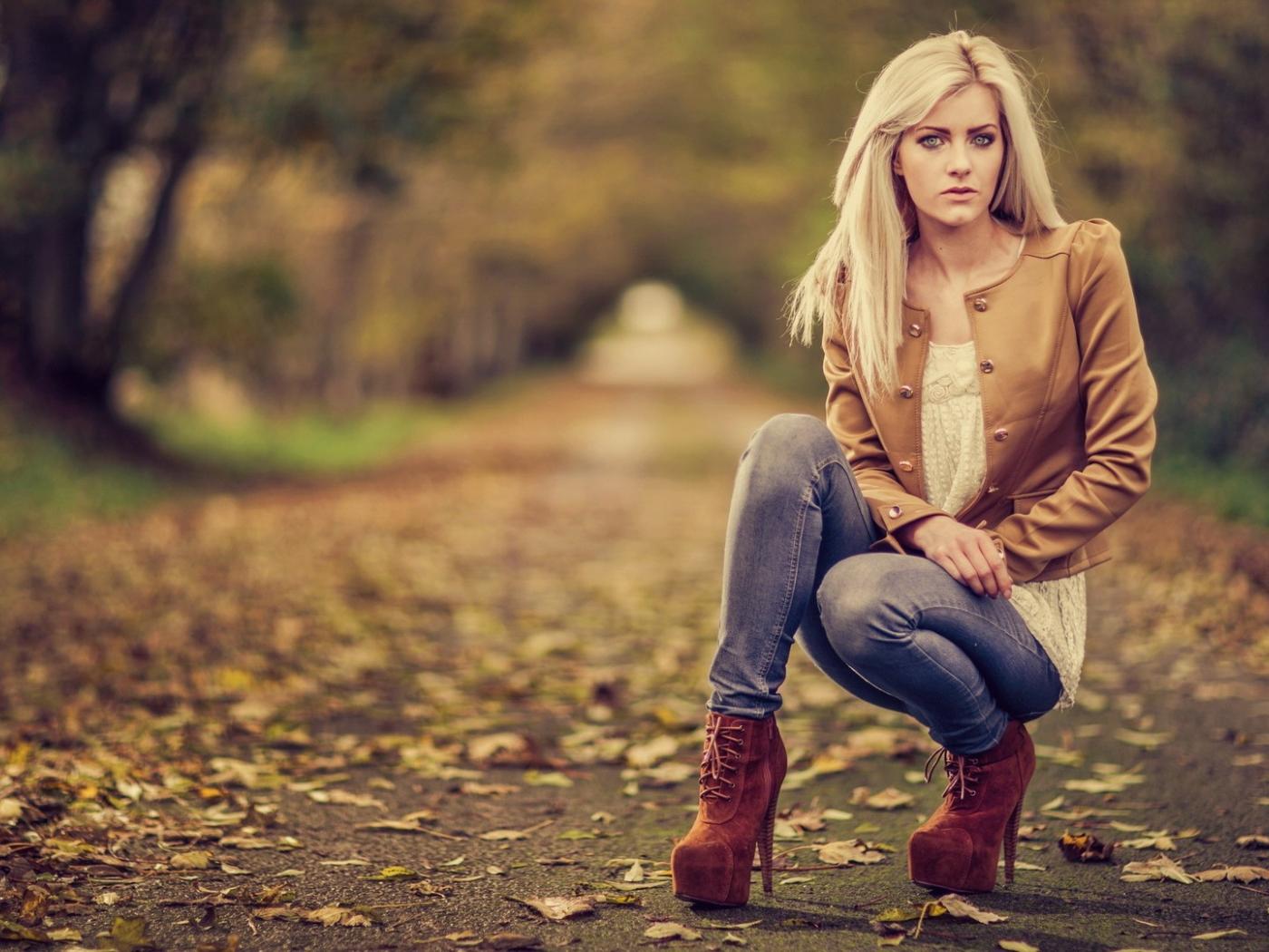 Wallpaper Girl in high heels squatting in the park